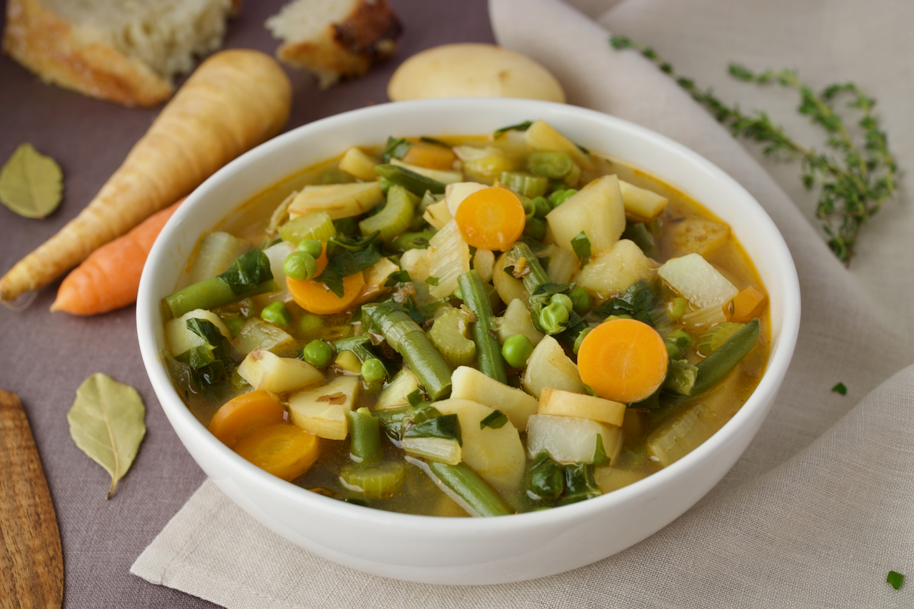 This hearty vegetable stew is incredibly flavourful, warming and healthy. It’s made with a variety of root and other vegetables: leek, celery, potato, carrot, parsnip, kohlrabi, green beans, Swiss chard and green peas. It’s very low in calories and a great option for an appetiser. The inspiration for this recipe came to me when visiting a Slovenian restaurant Slovenska hiša Figovec where they served this kind of dish amongst other traditional Slovenian dishes.